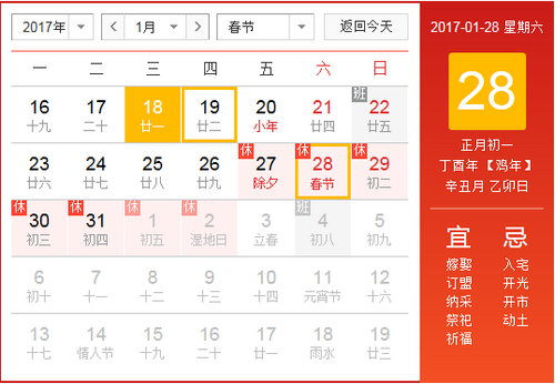一、放假時間安排:2017年1月25日(星期三)至2017年2月5日(星期日)放假,共12天,2月6日(星期一)正常上班;