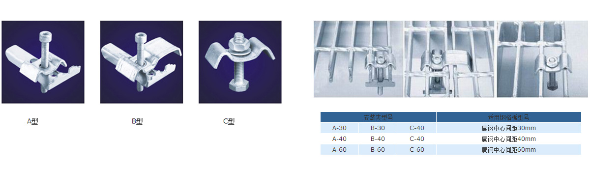 2. B型:由一塊帶雙鉤的上壓板(其中一個(gè)鉤可將相鄰的兩塊鋼格板連接在一起),一塊帶齒的下壓板和一支M8的內(nèi)六角螺栓組成。