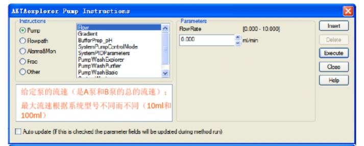 Fig 4、AKTA Explorer的泵清洗操作4、安裝層析柱在manual里選擇pump→flow rate,輸入一定的低流速(Fig 5),insert;選擇Alarm&mon→alarm pressure,設(shè)置high alarm(輸入填料或?qū)游鲋哪褪軌毫?,以較低者為設(shè)置值,具體可在填料說明書或?qū)游鲋f明書中查到),insert,execute(Fig 6) 。待InjectionValve的1號位管道流出水后接入柱子的柱頭,稍微擰緊后將柱下端的堵頭卸掉接入管道連上紫外流動(dòng)池。