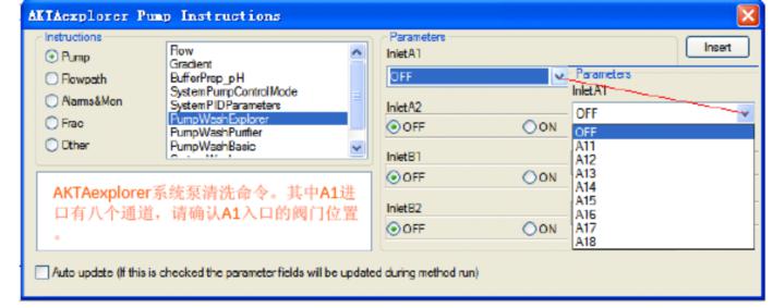3、清洗及管道準(zhǔn)備首先將A泵的進(jìn)液管道(A1)放入緩沖液或平衡液中,將B泵的進(jìn)液管道(B1)放入高鹽溶液中,在system control窗口點(diǎn)擊工具欄內(nèi)的manual,選擇 pump→pump wash explorer,選中A1,B1管道為ON, execute。泵清洗將自動(dòng)結(jié)束。(Fig 4)