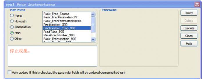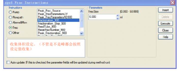 Fig 8、AKTA Explorer的洗脫條件設(shè)定操作4)設(shè)定收集:選擇Frac→fractionation_900,輸入每管收集體積,exectue(Fig 9)。結(jié)束固定體積收集選擇Frac→fractionation_stop_900,exectue(Fig 10)