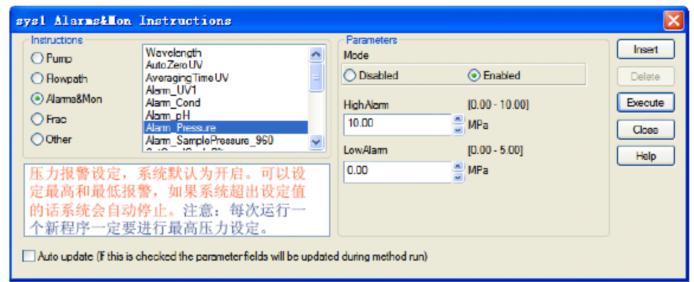 Fig 6、AKTA Explorer的限壓設(shè)定操作5、開始純化:1)在柱子平衡好之后(電導(dǎo),pH的數(shù)值和變化趨勢穩(wěn)定)即開始上樣了。此時(shí)應(yīng)將紫外調(diào)零(Fig 7),選擇Alarm&mon→autozero,exectue。
